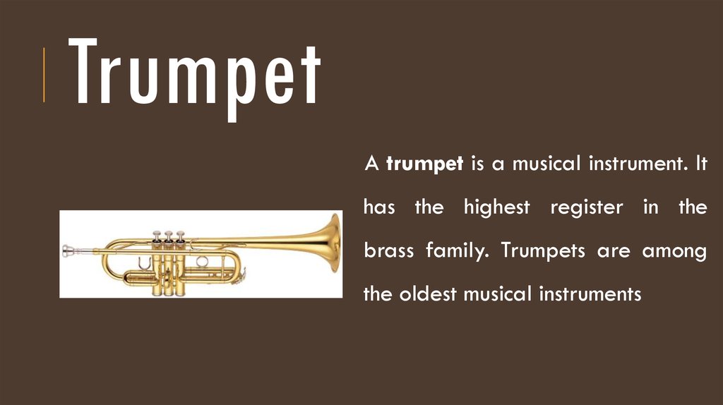French Horn Wikipedia from upload.wikimedia.org If you guessed the brass family got its name because the instruments are made of brass, you'd be exactly right! You vibrate the instrument by striking, shaking, or scraping. This family of instruments can play louder than any other and can also be heard from far away (hello neighbors). This brass instrument is the smallest and highest pitched. Most brass instruments are made out of, you guessed it brass! The trumpet/cornet, the french horn, the trombone, the baritone/euphonium, and the tuba/sousaphone.sound is produced by each instrument in the family by buzzing the lips together into the mouthpiece. Many of the world's most important genres like jazz and orchestra wouldn't be possible without brass instruments. Valved brass instruments use a set of valves (typically three or four but as many as seven or more in some cases) operated by the player's fingers that introduce additional tubing, or crooks, into the instrument, changing its overall length.this family includes all of the modern brass instruments except the trombone: